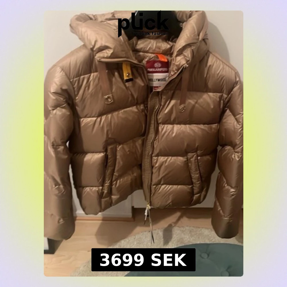 Snygg beige dunjacka från Parajumpers med kort modell, stor huva och dragkedja framtill. Jackan har två stora fickor och coola detaljer som gul rem vid halsen. Perfekt för kalla vinterdagar och riktigt trendig look.