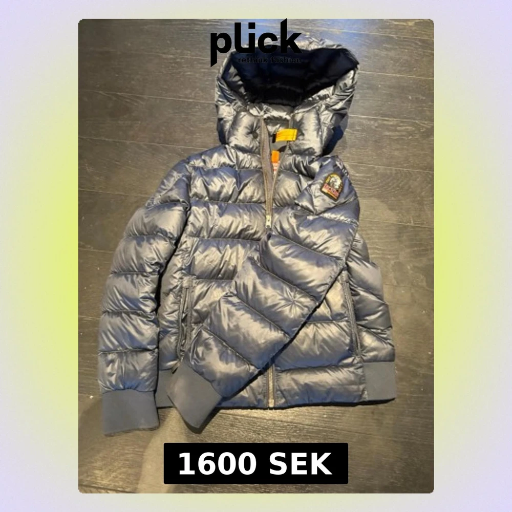 Snygg mörkblå dunjacka från Parajumpers med huva och ribbade muddar. Jackan har en patch på ärmen, men syns nästan inte, två sidofickor med dragkedja och quiltad design. Perfekt för kalla dagar och riktigt trendig look. Är som en liten Small ungefär.