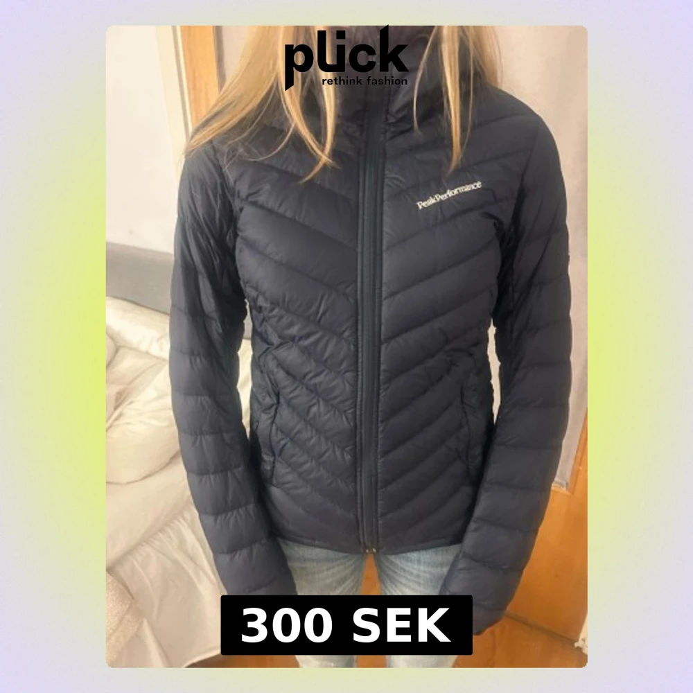 Snygg svart dunjacka från Peak Performance med huva och dragkedja framtill. Jackan har ett quiltat mönster och logga på bröstet. Perfekt för kalla vinterdagar och riktigt skön att bära.