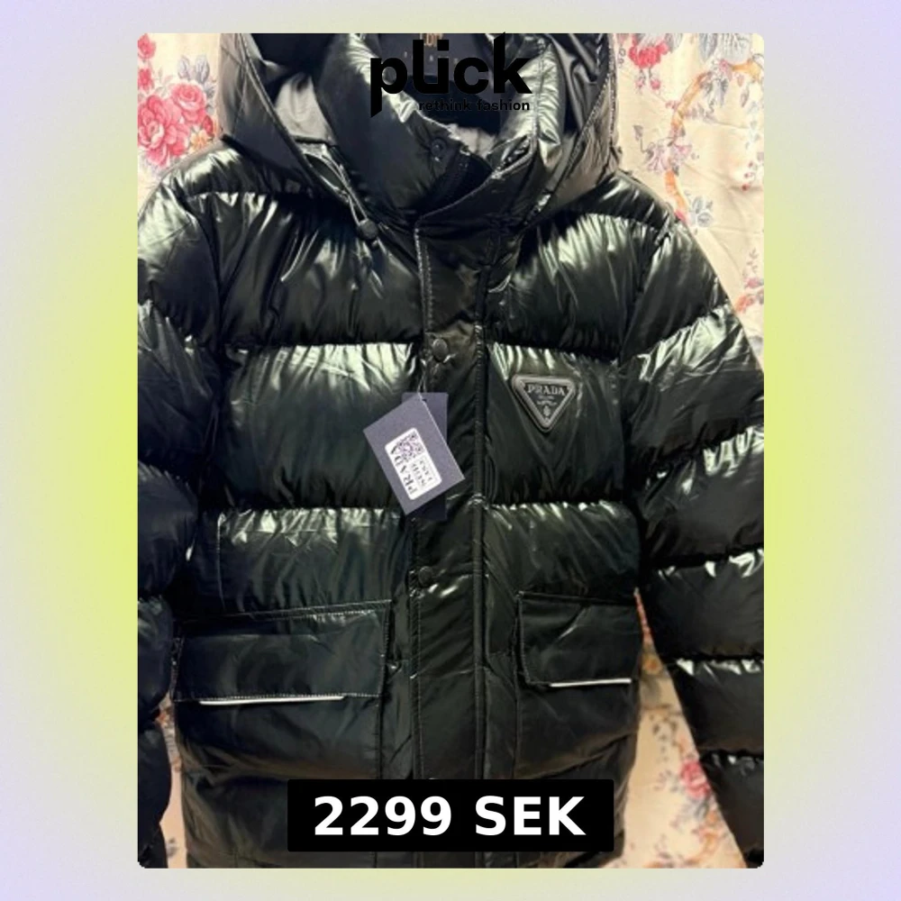 Svart dunjacka från Prada med huva - Säljer en svart, glansig dunjacka från Prada med stor huva och dragkedja framtill. Jackan har en bröstficka med dragkedja och ikonisk Prada-logga. Puffig modell som håller dig varm under kalla dagar. Perfekt för vintern och riktigt snygg streetstil. Lite mindre i storleken.