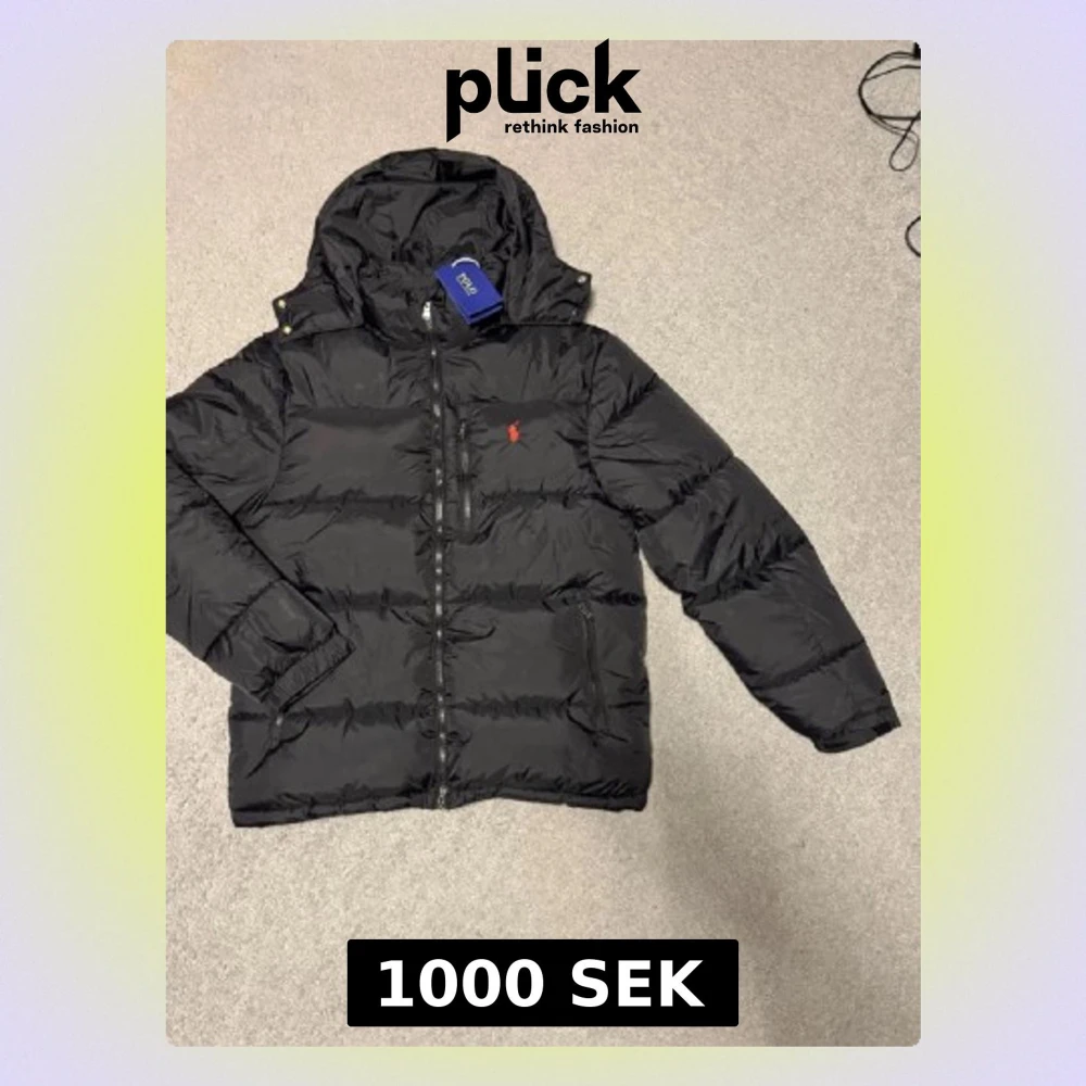 Svart dunjacka med huva från Polo Ralph Lauren. Jackan har dragkedja framtill, två sidofickor och den klassiska röda loggan broderad på bröstet. Perfekt för kalla vinterdagar och riktigt snygg streetstil.