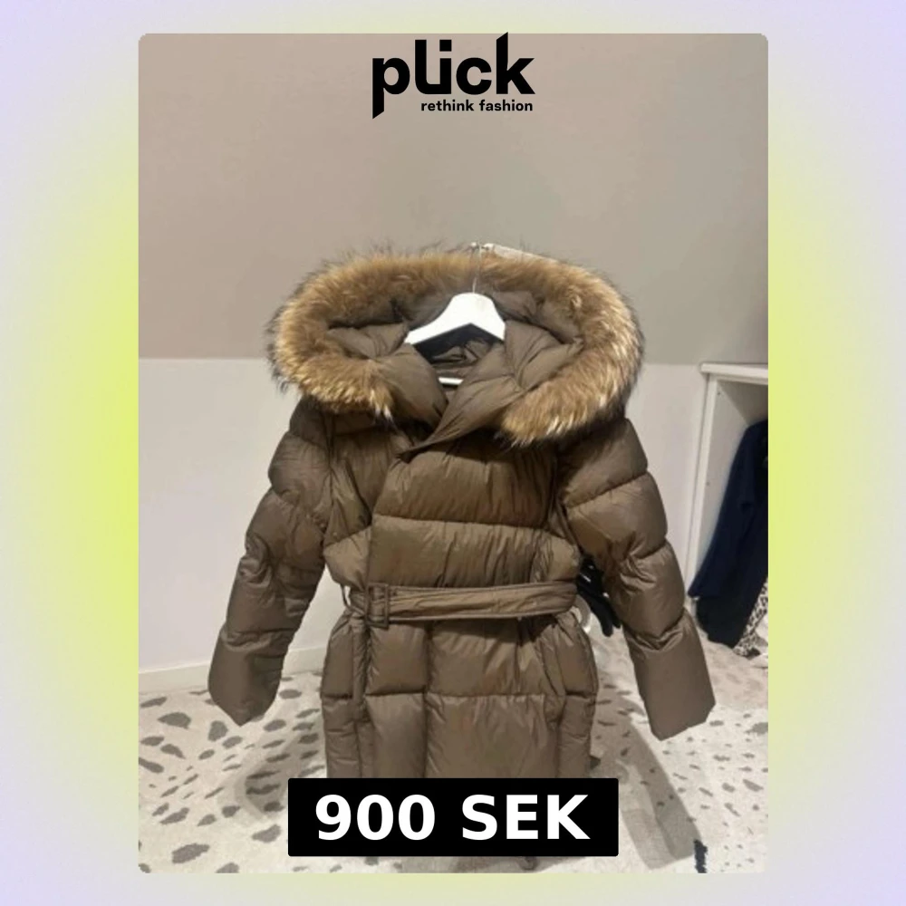 Snygg brun dunjacka med stor huva kantad av fuskpäls och tillhörande bälte i midjan. Jackan har puffig passform, quiltade paneler och långa ärmar. Perfekt för kalla vinterdagar och ger en trendig siluett.