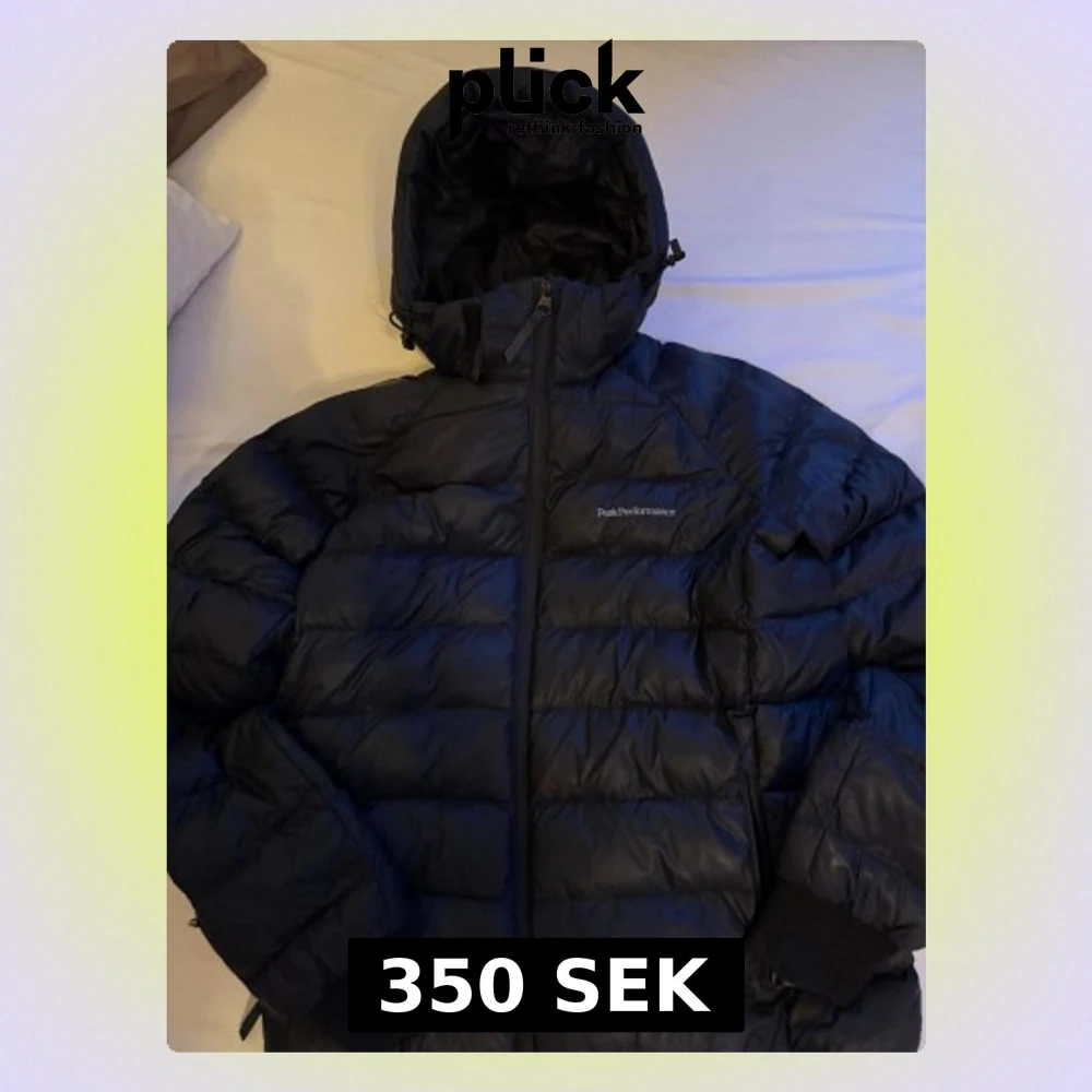 Snygg svart dunjacka från Peak Performance med huva och dragkedja framtill. Jackan har diskret logga på bröstet och breda, quiltade paneler. Perfekt för kalla vinterdagar och riktigt varm tack vare dunfyllningen.