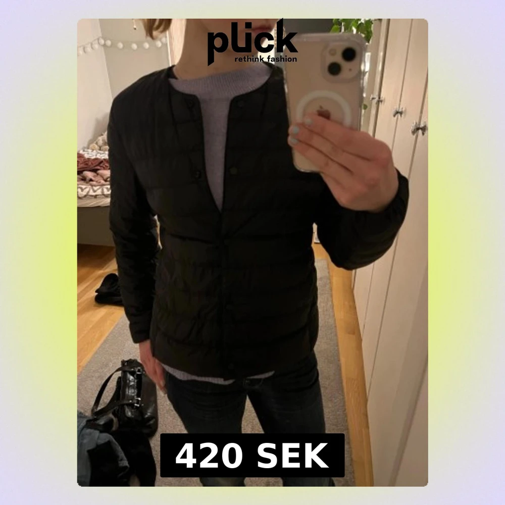 Säljer en svart, tunn dunjacka med knappar. Köptes för ca 750 kr.