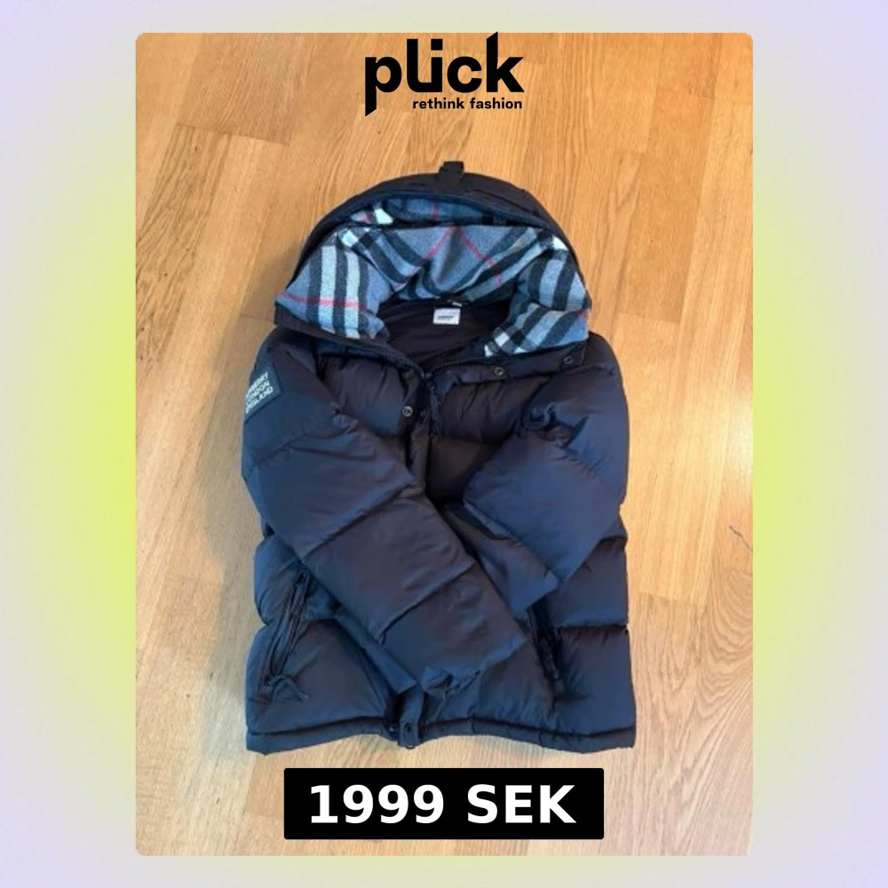 Snygg svart jacka från burberry med quiltad design och stor huva. Insidan av huvan har ett rutigt foder i grått, vitt och rött. Västen har dragkedja framtill och två sidofickor. Perfekt för kalla dagar när du vill hålla stilen.