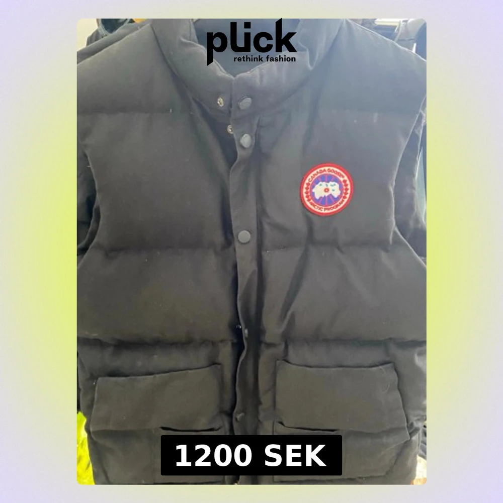 Säljer en svart dunväst från Canada Goose med klassisk logotyp på bröstet och två stora fickor framtill. Västen har hög krage, tryckknappar och dragkedja. Tillverkad i slitstarkt material och fylld med dun för extra värme. Perfekt för kalla dagar.
