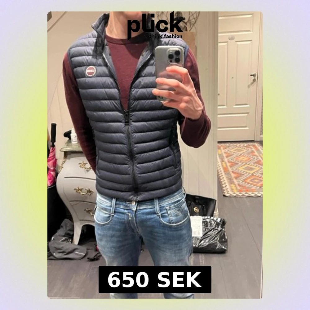 Snygg mörkblå dunväst från Colmar med quiltad design och hög krage. Västen har två dragkedjeförsedda fickor och ett tydligt Colmar-märke på bröstet. Perfekt att slänga över en hoodie eller tröja för extra värme och stil🤩. Skick 9/10🙌. Tveka inte att ställa frågor🤝