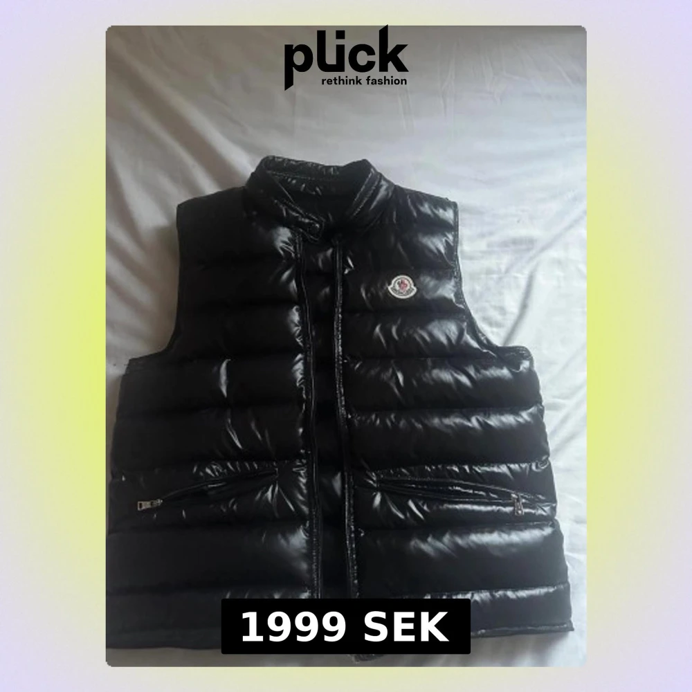 Snygg svart dunväst från Moncler med glansig finish och diskret logga på bröstet. Västen har ståkrage, två dragkedjeförsedda fickor och quiltad design. Perfekt för lager-på-lager och streetwear-stil.