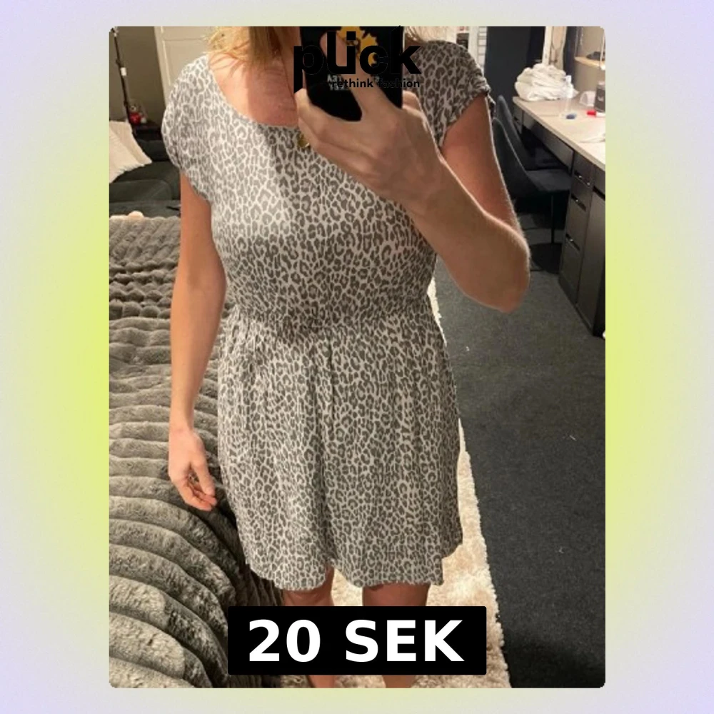 Säljer en kort klänning från ONLY i storlek 38 med grått leopardmönster. Klänningen har rund halsringning, korta ärmar och ett lätt rynkat midjeparti som ger en snygg siluett. Materialet känns mjukt och luftigt, perfekt för dig som gillar djurmönster.