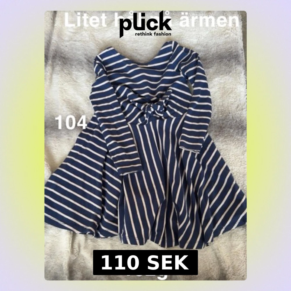 Supersöt blåvit randig klänning med lång ärm och knyt i midjan. perfekt för dig som gillar en avslappnad men ändå stilren look. Passar till både chill och mer uppklädda tillfällen.🌸 Litet hål på ärmen. Storlek 104