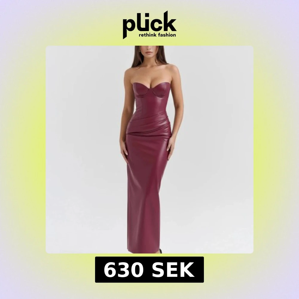 Säljer en vinröd, figurnära långklänning i skinnimitation med axelbandslös design och snygg snörning i ryggen. Klänningen har en markerad byst och slät siluett som ger en cool och elegant vibe. Perfekt för dig som vill sticka ut med en edgy look. Size Xs