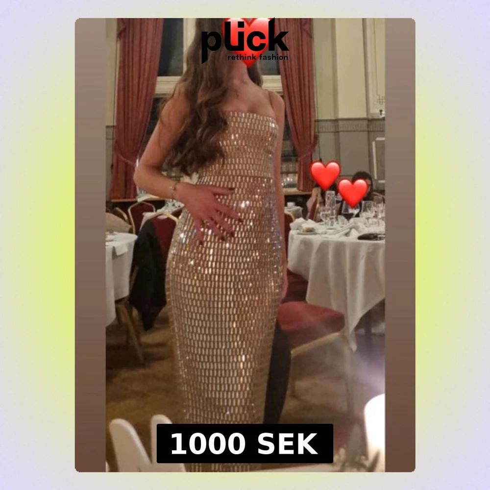Säljer en glittrig långklänning i guld med figurnära passform och axelbandslös design. Band följer med som man kan sätta dit om man vill. Klänningen har ett snyggt kristallmönster som reflekterar ljuset och ger en lyxig känsla. Perfekt för dig som vill sticka ut på bal eller fest. Från oh polly använd endast en kväll.