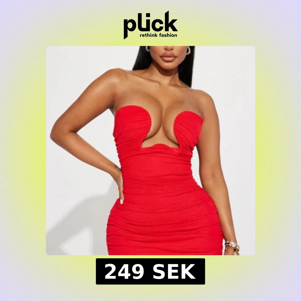 Snygg röd axelbandslös miniklänning med unik uringning och tight passform. Klänningen har rynkade detaljer och är figurnära, perfekt för dig som vill sticka ut. Materialet känns stretchigt och bekvämt mot kroppen.