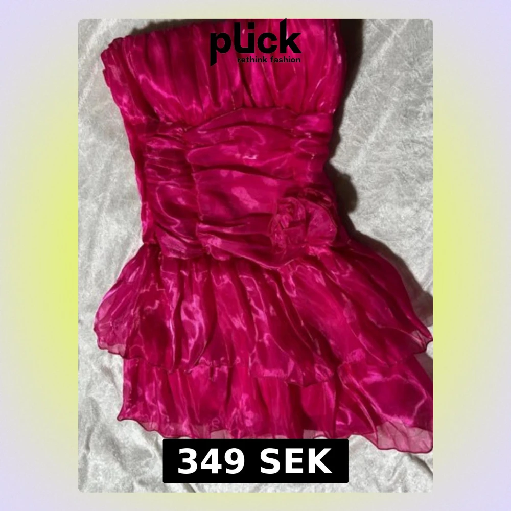 Säljer en axelbandslös kortklänning i stark rosa färg med glansigt tyg och volanger. Klänningen har en smockad rygg och en dekorativ blomdetalj framtill. Materialet känns som syntet och ger en festlig look med mycket volym och struktur. Storlek 34/36