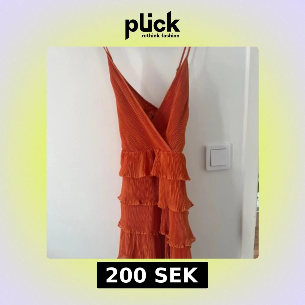 Säljer en superfin orange långklänning med smala axelband och omlott-v-ringning. Klänningen har flera lager volanger och är plisserad i ett lätt material som ger ett flowy intryck. Perfekt för dig som vill sticka ut med färg och stil.