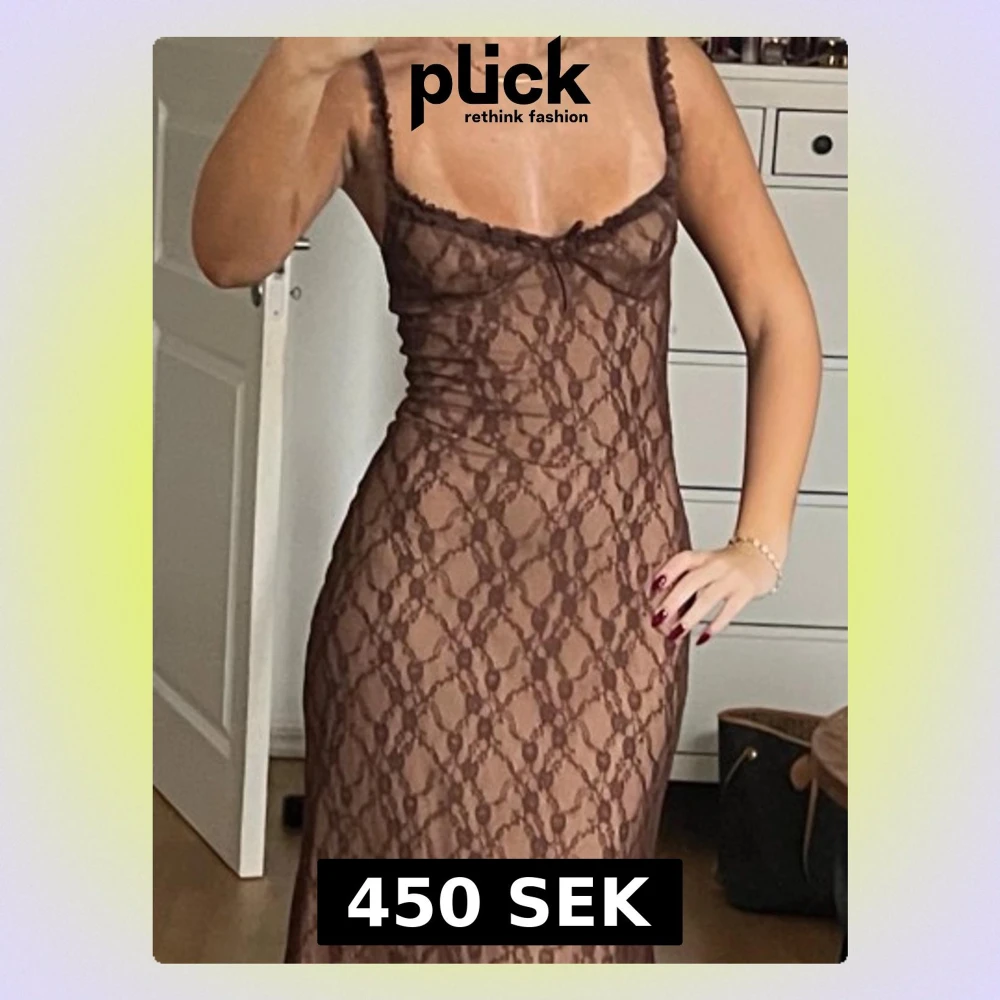 Säljer en brun långklänning i spets med smala axelband och liten rosett framtill. Klänningen har figurnära passform och ett blommigt spetsmönster som ger en elegant look. PRISLAPP KVAR