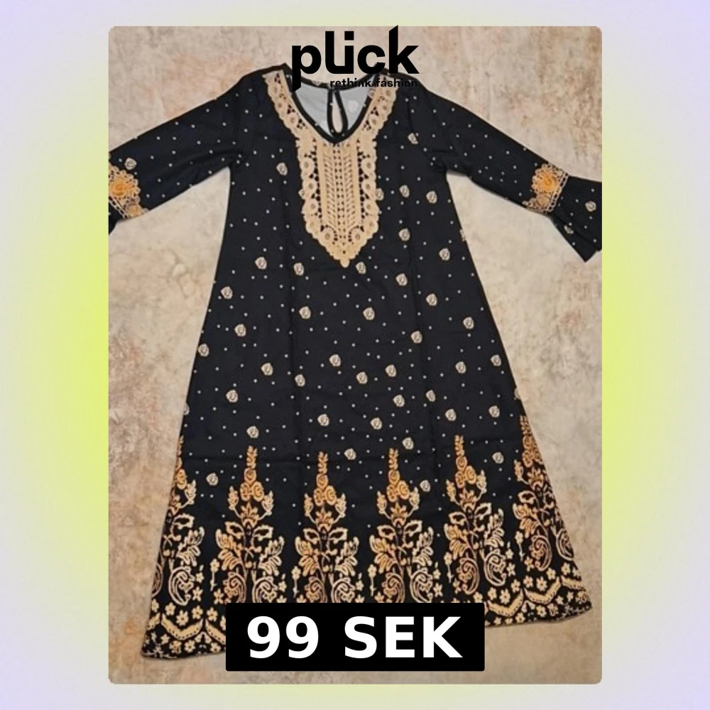Supersnygg svart långklänning med guldiga broderier och blommönster. Klänningen har v-ringning med dekorativ spets och långa ärmar med broderade detaljer vid ärmsluten. Perfekt för dig som vill sticka ut med eleganta detaljer och unik design.