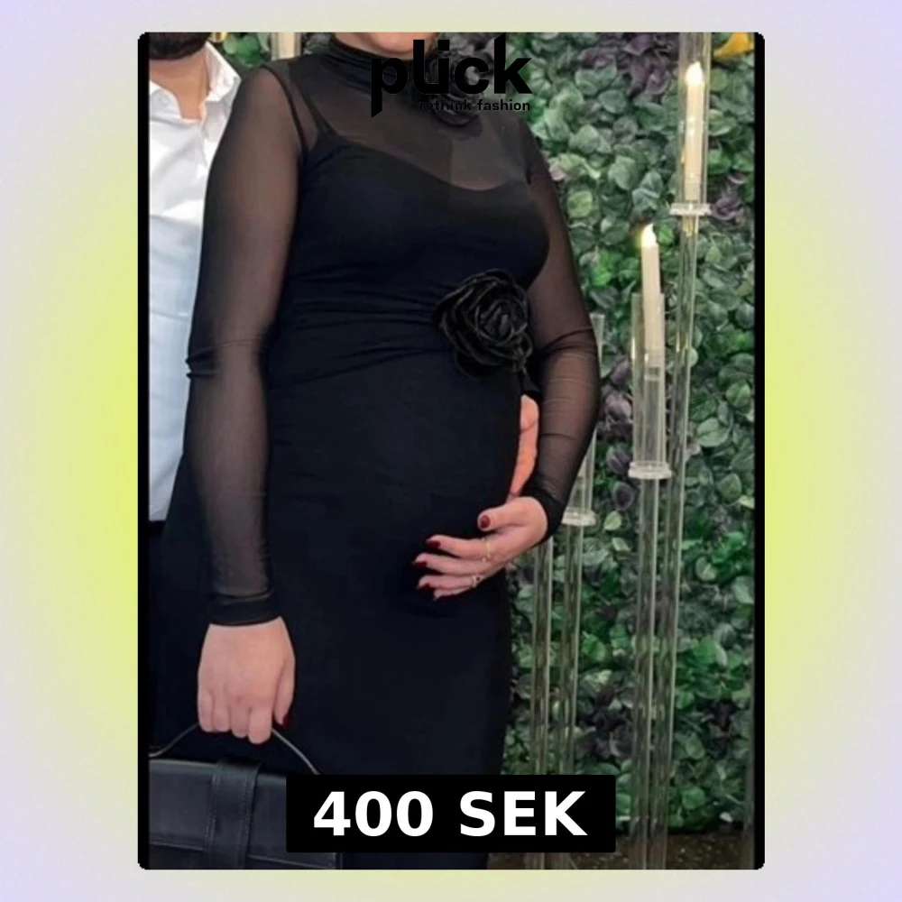 Elegant svart långklänning med transparenta meshärmar och höghalsad design. Klänningen har dekorativa svarta blommor vid halsen och midjan för en extra detalj. Perfekt för dig som vill sticka ut med stilren look. Funkar utmärkt för gravida och som vill känna sig extra eleganta och söta. Pris går att diskutera.