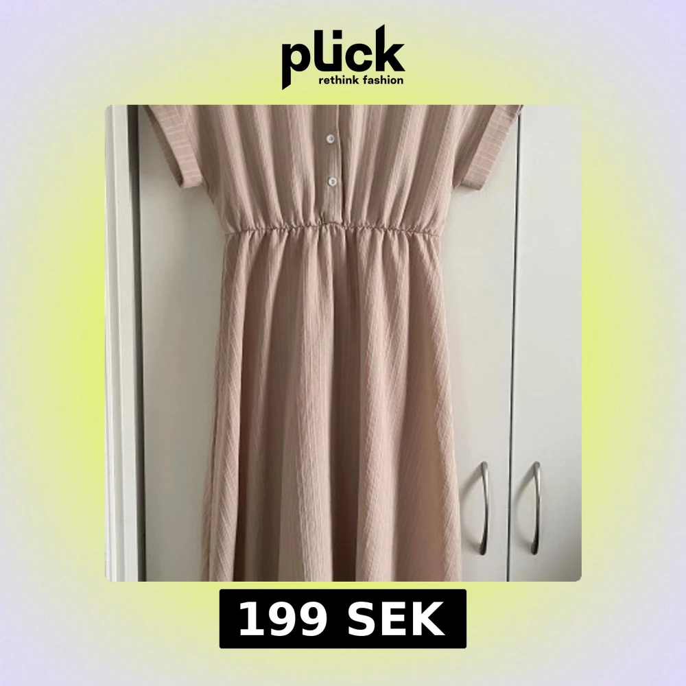 Säljer en stilren beige klänning med korta ärmar och knappar framtill. Klänningen har en elastisk midja som ger en fin passform. Perfekt för en avslappnad look.