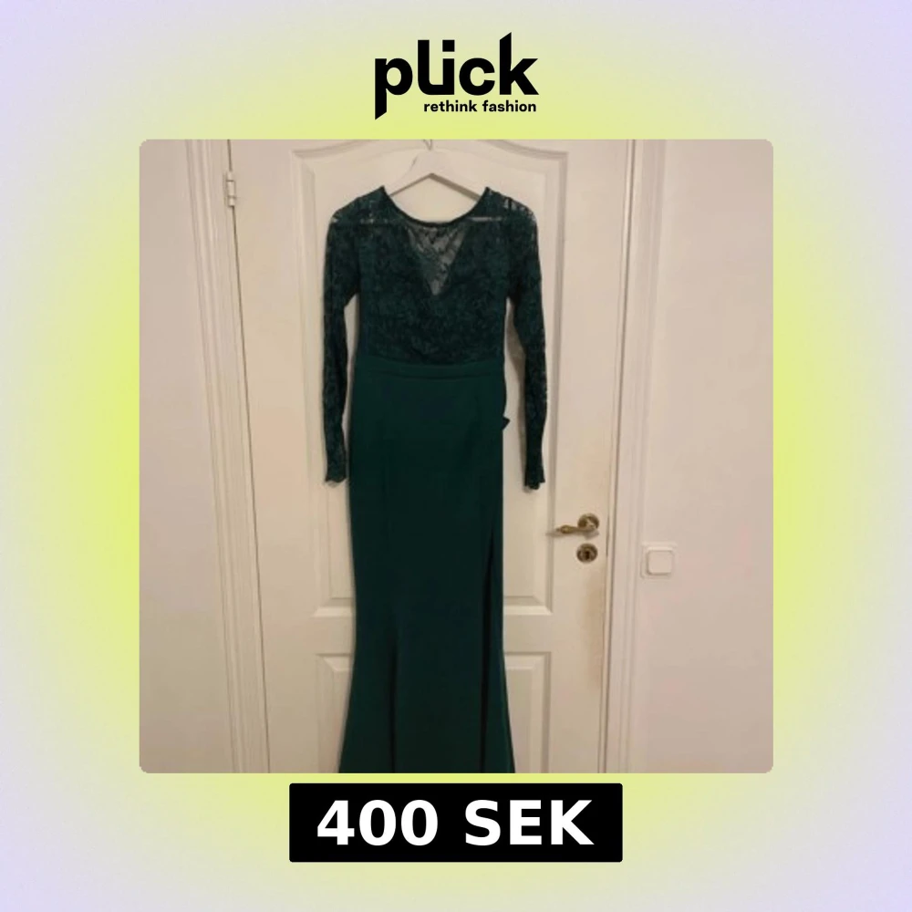 Elegant grön långklänning från KDK London med spetsdetaljer och en stor rosett bak. Klänningen har en v-ringad design och långa ärmar. Tillverkad i polyester och elastan med spets i nylon. Perfekt för en speciell kväll! 🌟