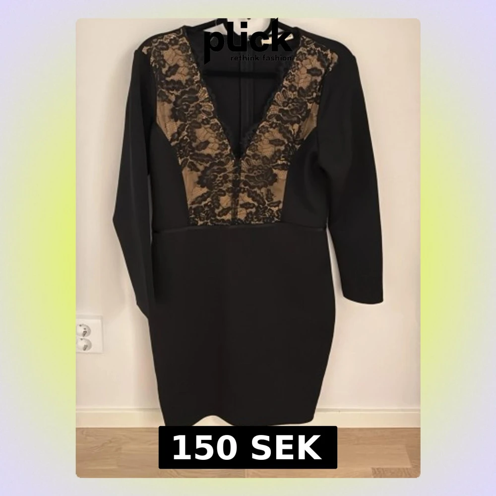 Snygg svart kortklänning från Oasis med djup v-ringning och dekorativ spets i svart och beige framtill. Klänningen har långärmade ärmar och figurnära passform, perfekt för dig som vill sticka ut med elegans och stil.