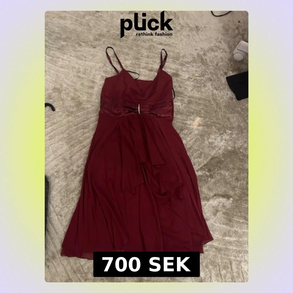 Elegant vinröd långklänning med smala axelband och v-ringning. Klänningen har omlottliknande lager framtill och ett dekorativt band med liten detalj i midjan. Perfekt för speciella tillfällen. Priset kan diskuteras