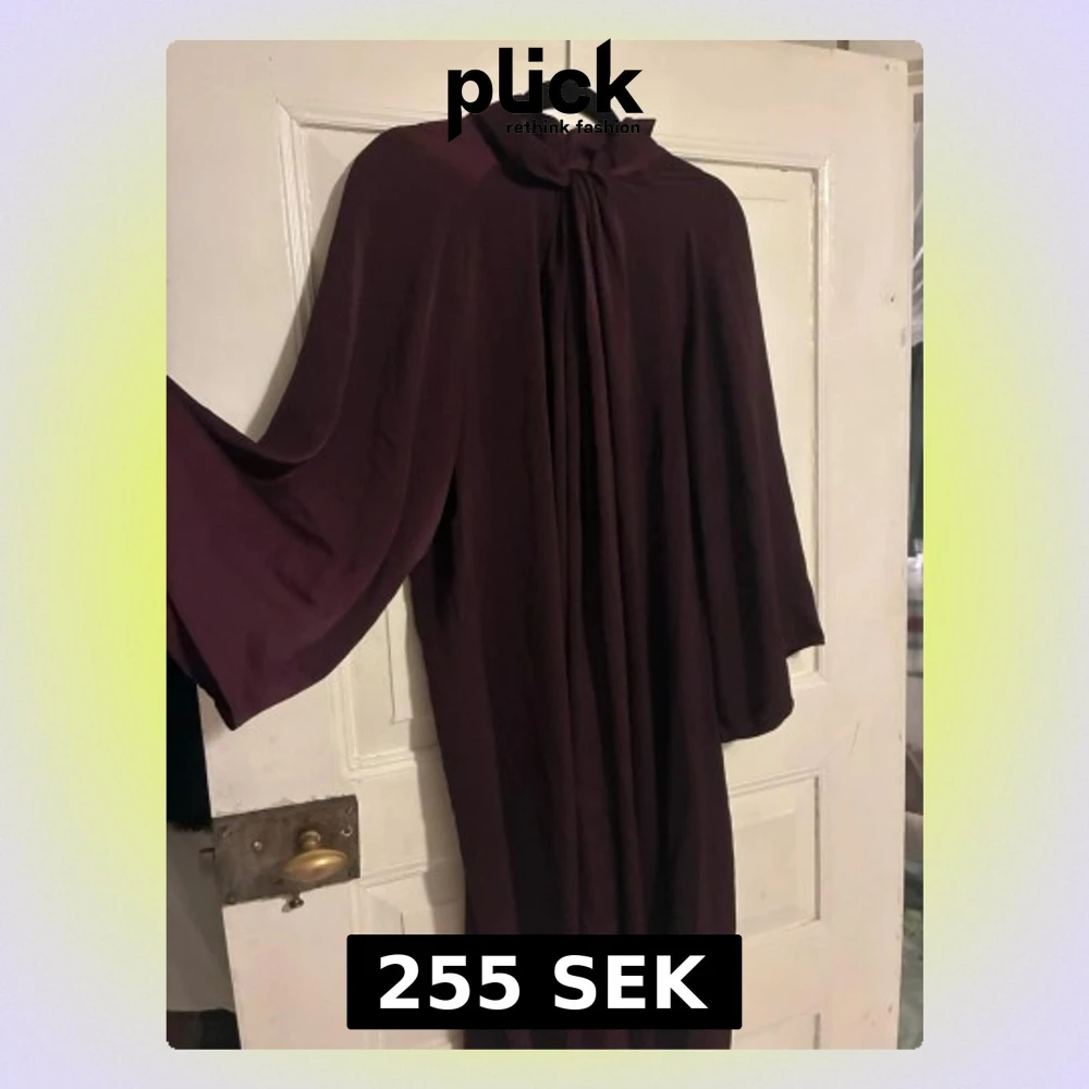 Elegant vinröd/lila långklänning med lös passform och vida ärmar. Klänningen har ett snyggt knyt i halsen som ger en chic touch. Tillverkad i ett mjukt, flytande material som ger ett exklusivt intryck.