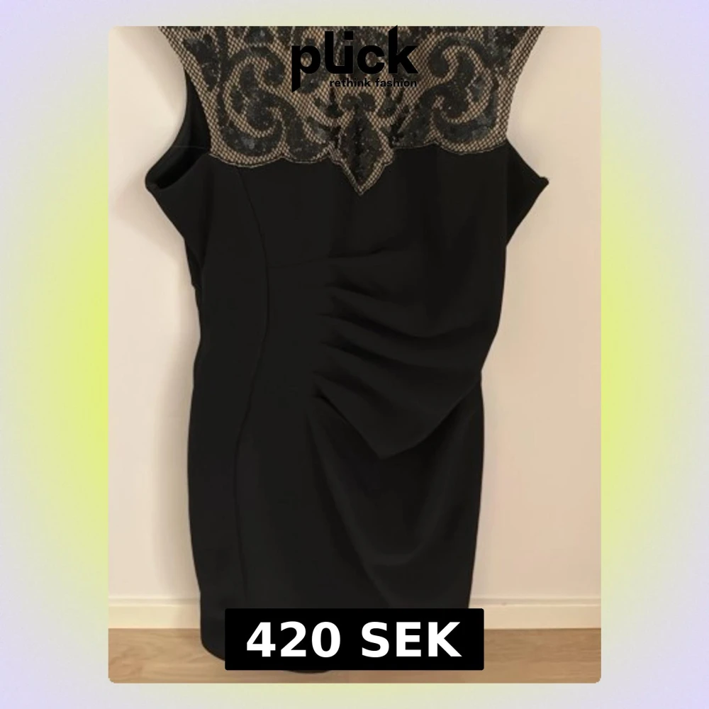 Elegant svart kort klänning med vackert mönstrad spets upptill i beige och svart. Klänningen har drapering framtill och är ärmlös med djup v-ringning i ryggen. Perfekt för dig som vill sticka ut med stilrena detaljer.