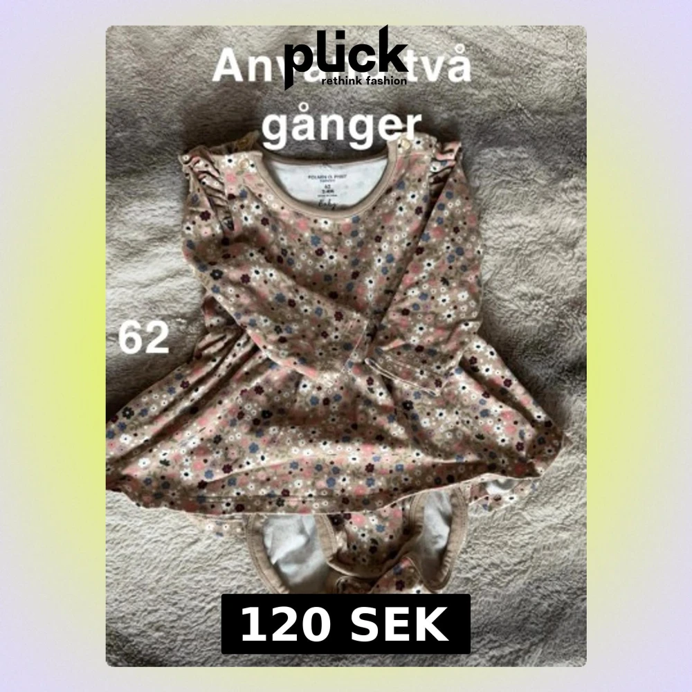 Supersöt babyklänning med inbyggd body från Polarn O. Pyret i storlek 62. Klänningen är beige med blommigt mönster i rosa, blått och vitt. Långärmad med volangdetaljer vid axlarna och tryckknappar vid halsen. 🌸 Använd två gånger. Storlek 62