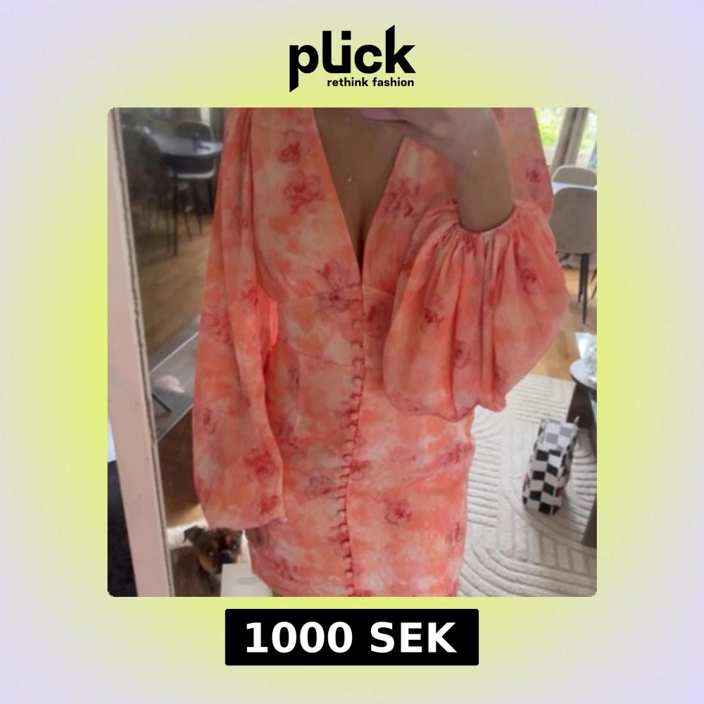 Superfin klänning i ljusa rosa och orange toner med blommigt mönster. Klänningen har djup v-ringning, puffiga långärmar och knappar längs hela framsidan. Materialet är lätt och flowy, perfekt för sommarens alla tillfällen.