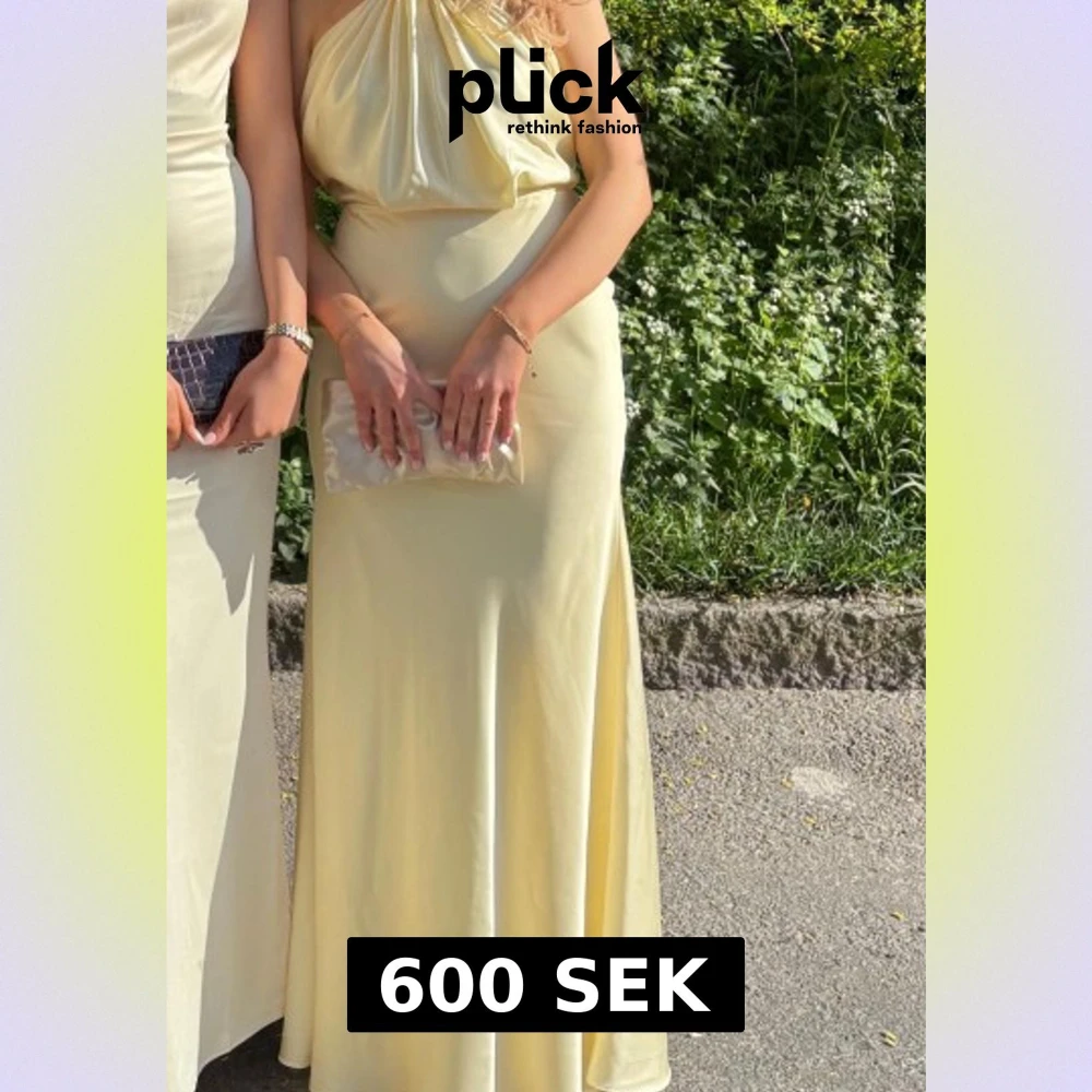 Säljer denna superfina ljusgula långklänning med halterneck. Perfekt för bal eller student. Materialet är rejält och känns ordentligt. Har använt en gång och då fick den en liiiten fläck men inget man märker💞 Bär vanligtvis XS/S så stor för att vara XXS. Är 165 men hade 8 cm klack på balen och den gick precis ner till marken💞