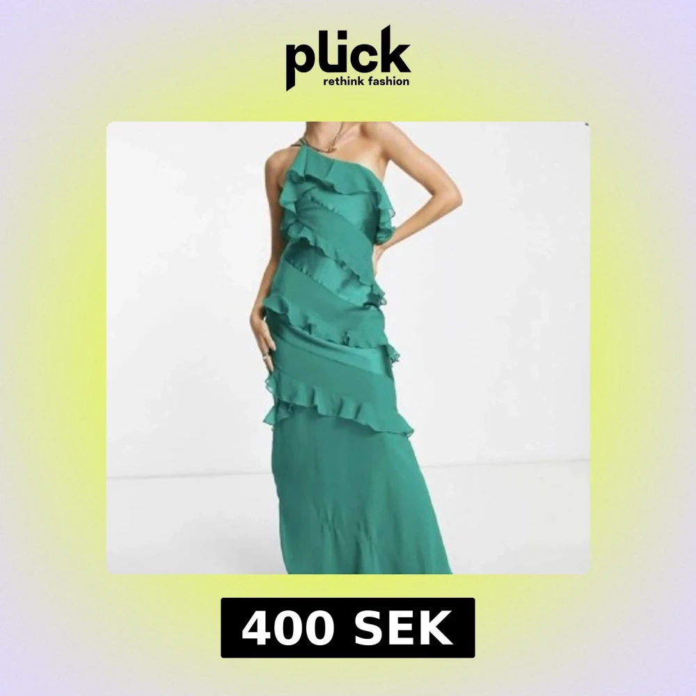 Säljer en snygg grön långklänning med volangdetaljer och oneshoulder-design. Klänningen är använd en gång under min bal och har inga fläckar🩷. Storleken är 34 men passar mig som har storlek 36 bra!!