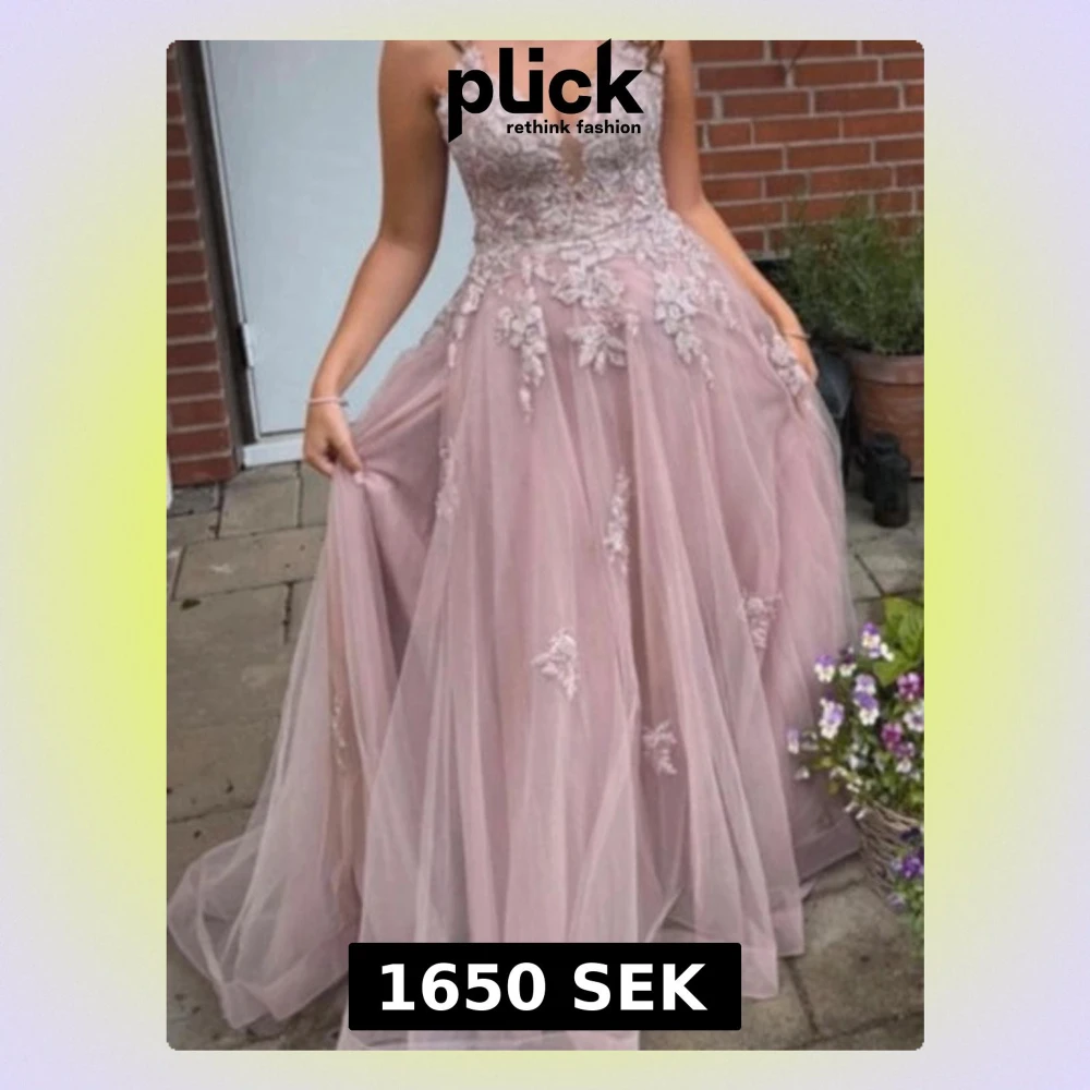 Romantisk ljusrosa/smutsrosa balklänning med vacker spets och blommiga applikationer. Klänningen har en djup urringning, tunna axelband som korsas i ryggen och en vid, svepande kjol i tyll. Öppen rygg med snörning för justerbar passform. Perfekt för bal eller speciella tillfällen.