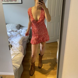 Blommig klänning - Säljer denna röda blommiga volanklänning i storlek 38. Man knyter själv i sida  vilket gör att den passar flera olika storlekar