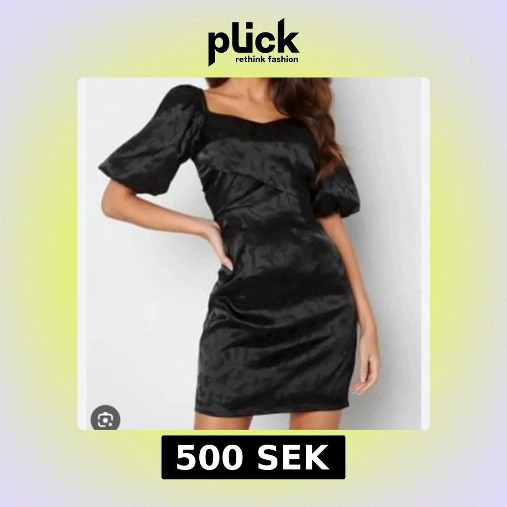 Snygg svart kort klänning med puffiga kortärmar och en smickrande figurnära passform. Klänningen har en lätt glansig yta och fyrkantig ringning