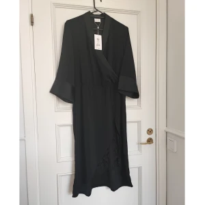 Kimonoinspirerad klänning i svart satin från Vila. Omlottmodell med resår i midjan. Slit på framsida med svart spets. Helt ny storlek 40
