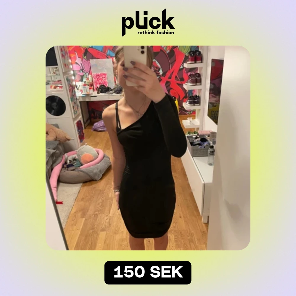 Svart klänning med en arm, har använt den väldigt lite. Man kan även välja vilken arm som man vill täcka