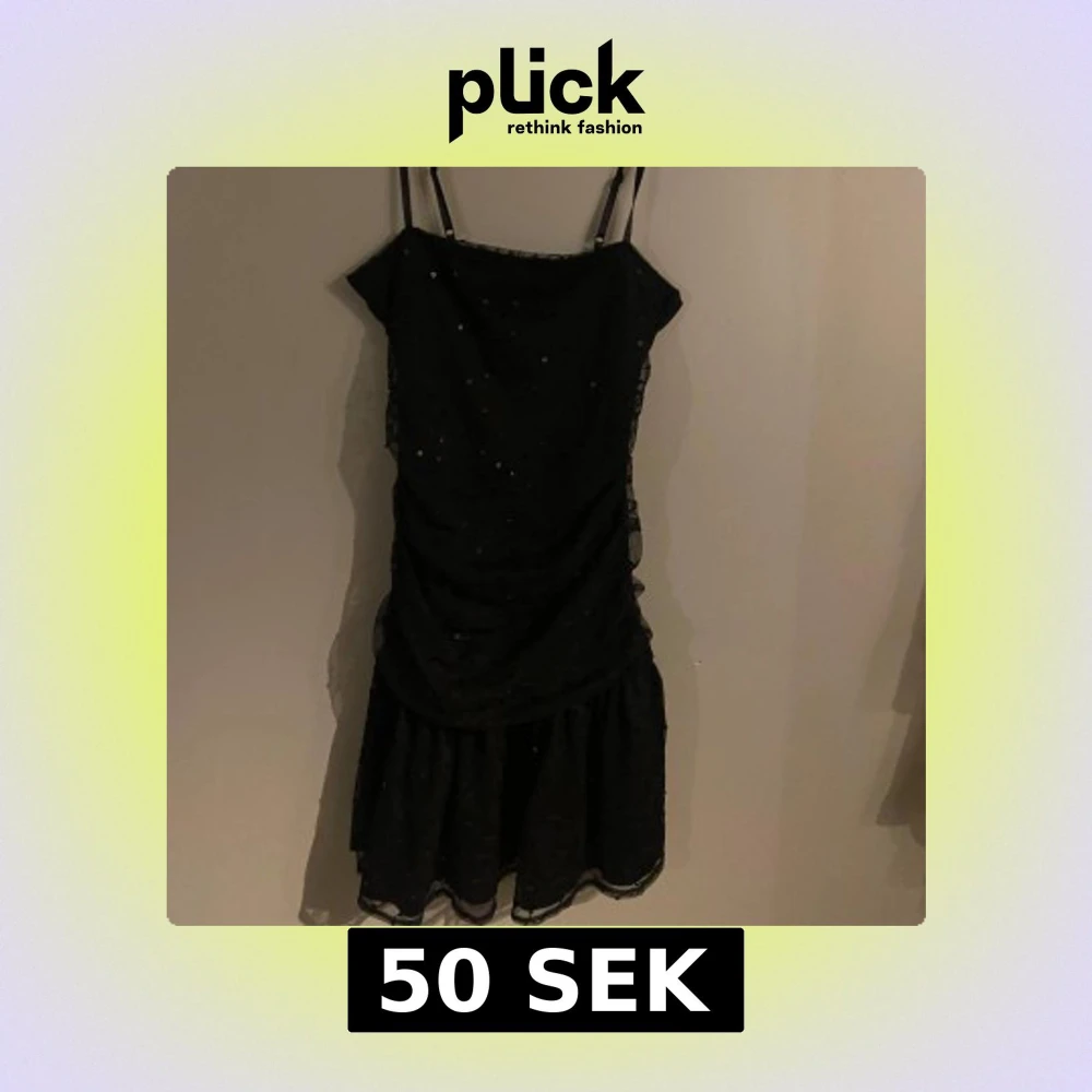 Supersnygg svart kortklänning från Gina Tricot med tunna axelband och glittriga paljettdetaljer. Klänningen har volang nertill