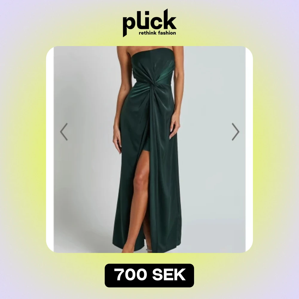 Grön långklänning med slits framtill. Använd en gång. Har sytt in den i midjan/ brösten så den inte åker ner.