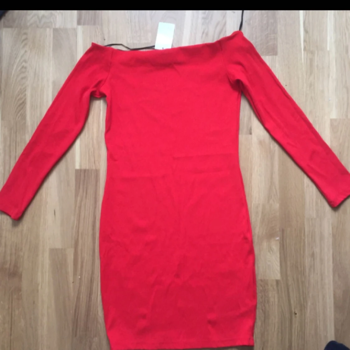 Röd off shoulder klänning. Prislapp kvar. Passar även 38.