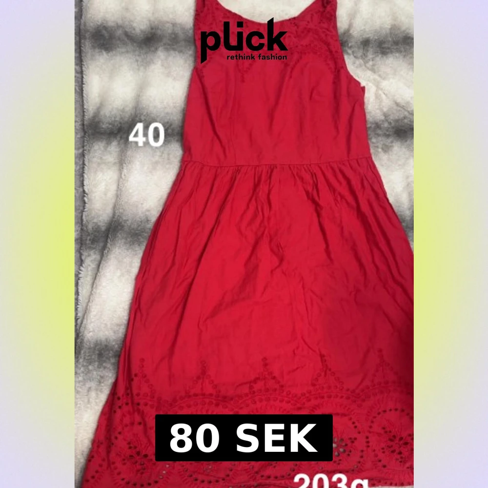 Snygg röd klänning med ärmlös design och vackra broderade spetsdetaljer upptill och längs nederkanten. Klänningen har en feminin siluett och rundad halsringning, perfekt för dig som vill sticka ut med färg och detaljer.🌸 Fint använt skick. Storlek 40