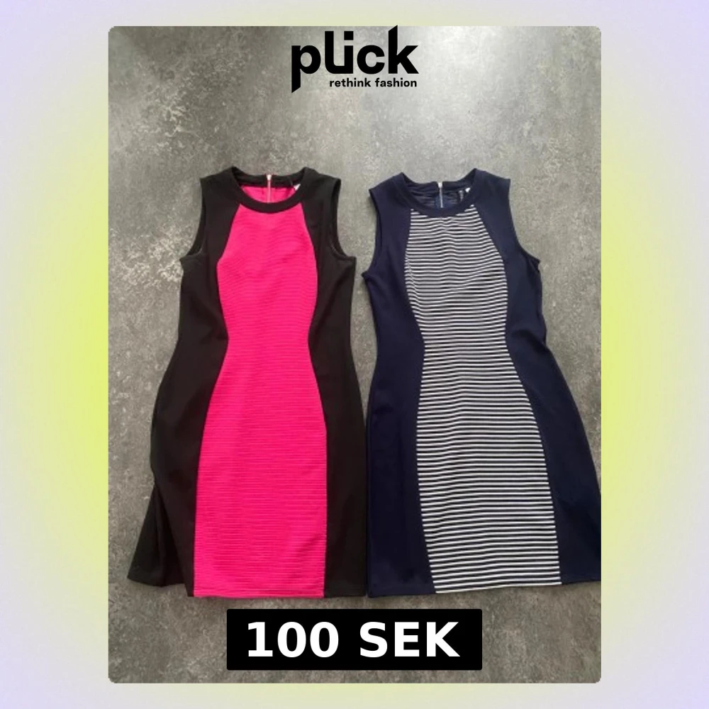 Säljer två snygga korta klänningar från H&M. Ena är svart med ceriserosa mittpanel och ribbad struktur, den andra är marinblå med vit- och marinblått randigt mönster framtill. Båda är ärmlösa och har dragkedja bak. Perfekta för dig som vill sticka ut! Endast 100 kr för båda