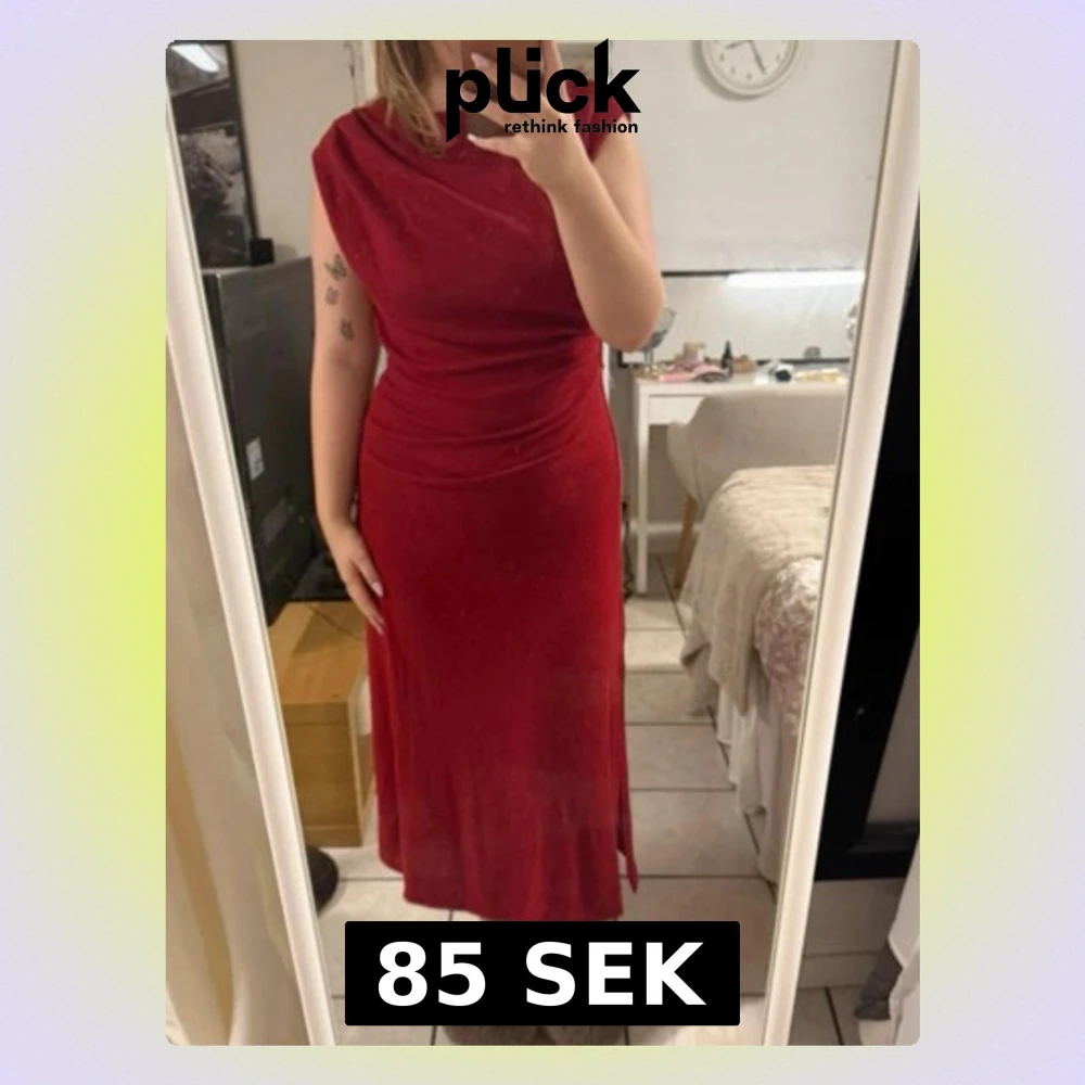 Snygg röd långklänning med en axel och slits på sidan. Mycket mjukt material, aldrig använd men ingen lapp kvar
