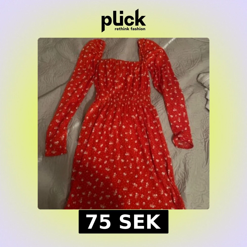 Superfin röd klänning med små vita blommor och långa ärmad. Smockad överdel och markerad midja ger en snygg siluett. Perfekt för vår och sommar! Det blir kvadratringad vid halsen