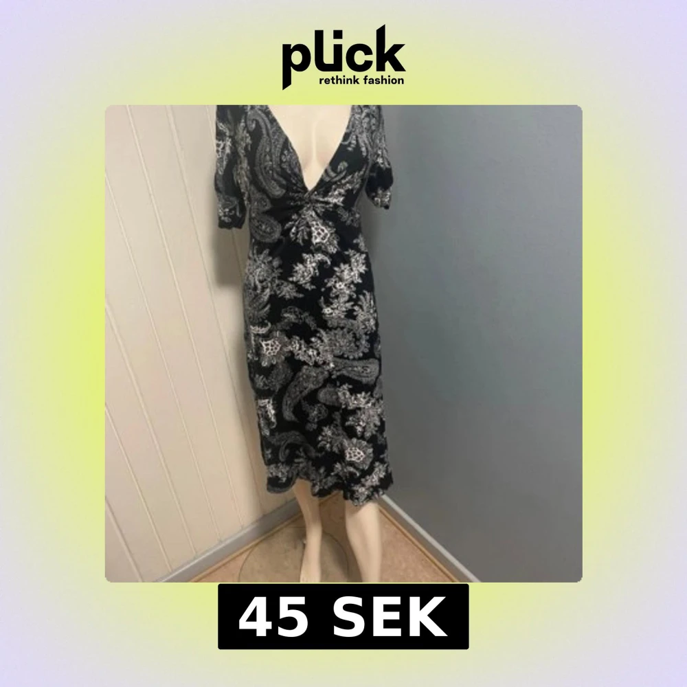 Säljer fem snygga klänningar med v-ringning. Ena klänningen är svart med vitt paisleymönster och har kort ärm, den andra har färgglatt orientaliskt mönster i rosa, blått och grönt. Båda är knälånga och har en avslappnad passform.