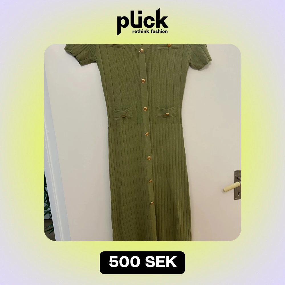 Säljer en olivgrön ribbad klänning med korta ärmar och v-ringning. Klänningen har dekorativa knappar i guld längs framsidan och två små fickdetaljer på bröstet. Perfekt för både vardag och festliga tillfällen!