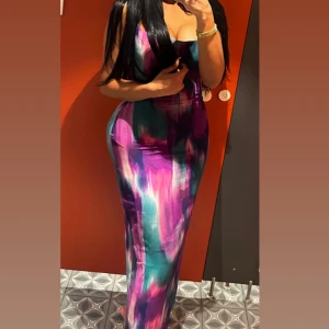 Säljer en färgglad långklänning med ett abstrakt mönster i lila, rosa och turkos.