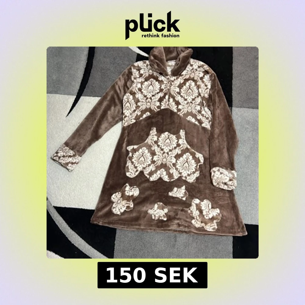 Unik brun velourklänning med lång ärm och hög krage. Klänningen har ett dekorativt vitt mönster på bröstet, fickan, ärmsluten och nedre delen. Mjuk och skön känsla, perfekt för dig som gillar retrovibbar och statement-plagg.