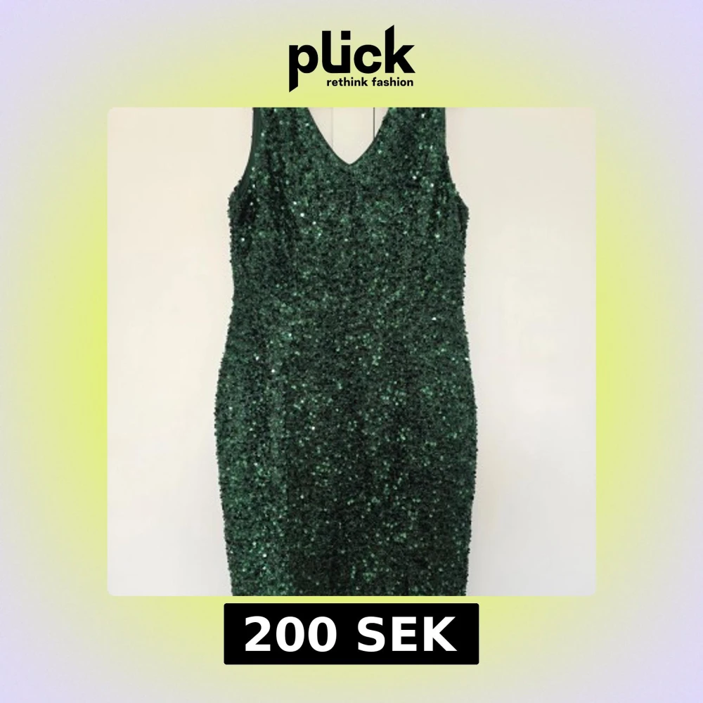 Säljer en oanvänd glittrig grön klänning täckt av paljetter. Klänningen har v-ringning både fram och bak och är ärmlös.