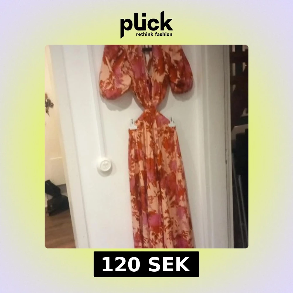 Säljer en långklänning med blommigt mönster i rosa och rött. Klänningen har puffärmar, v-ringning och markerad midja med cut-out-detalj. Perfekt för dig som vill sticka ut med en färgstark och unik look.